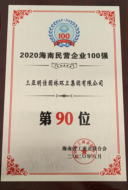 8月28日,“2020海南民營(yíng)企業(yè)百?gòu)?qiáng)發(fā)布會(huì)”在??谂e行。三亞明佳園林環(huán)衛(wèi)集團(tuán)有限公司再次入選“海南民營(yíng)企業(yè)100強(qiáng)”榜單,名列第90位。